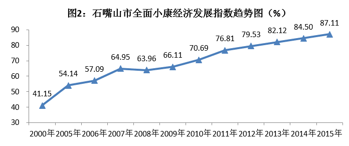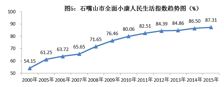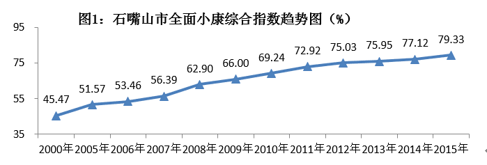 2015年,全市全面建成小康社会综合指数达79.33%,比2014年(77.12%)提高2.21个百分点,比“十二五”期间年均提高(2.02个百分点)高出0.19个百分点,但比“十一五”期间年均提高(3.53个百分点)低1.51个百分点。从年度发展看,受“三期叠加”因素影响,2013-2014年提高速度最为缓慢,分别较上年提高0.92个和1.17个百分点。