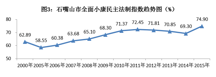 (二)民主法制方面。2015年,全市民主法制指数为74.90%,比2014年提高5.60个百分点,“十二五”期间累计提高3.53个百分点,年均提高0.71个百分点,比“十一五”年均提高(2.56个百分点)低1.85个百分点。