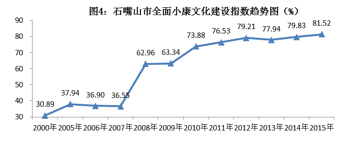 (三)文化建设方面。2015年,全市文化建设指数为81.52%,比2014年提高1.69个百分点,“十二五”期间累计提高7.64个百分点,年均提高1.53个百分点,比“十一五”年均提高(7.19个百分点)低5.66个百分点。