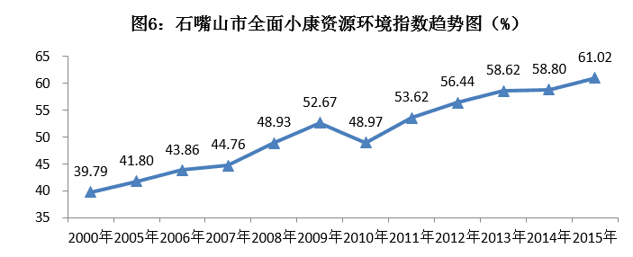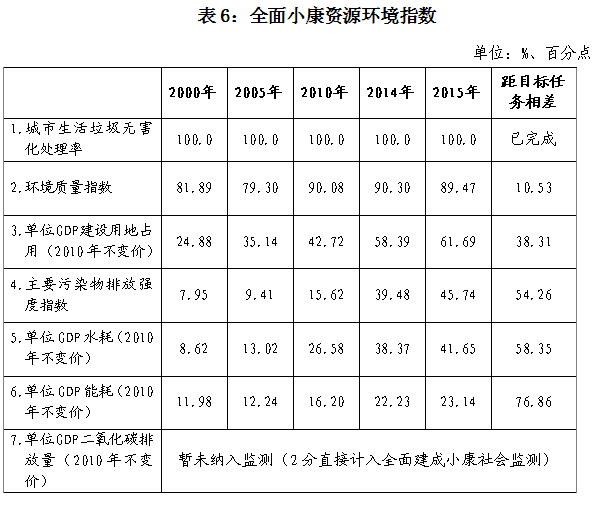 从监测的6项指标看:一是有2项指标保持较高水平。2015年,城市生活垃圾无害化处理率达97.4%(目标值≥85%),已完成全面建成小康社会目标任务;环境质量指数为89.47%(目标值=100%),达到较高水平,但比2014降低0.83个百分点,其中:地表水达标率为100%(已达到目标值)、建成区绿化覆盖率为40%(已达到目标值)、城市空气质量达标率为62.5%(目标值≥95%)、森林覆盖率为12.6%(目标值≥23%)。二是有4项指标“短板”特征明显。在监测的6项指标中,有4项低于80%。2015年,全市单位建设用地占用面积为97.26公顷/亿元(目标值≤60公顷/亿元),实现程度为61.69%,比2014年提高3.30个百分点;主要污染物排放强度指数为45.74%(目标值=100%),比2014年提高6.26个百分点;单位GDP水耗为264.08立方米/万元(目标值≤110立方米/万元,按2010年不变价计算),完成目标任务的41.65%,比2014年提高3.28个百分点;单位GDP能耗为2.85吨标准煤/万元(目标值≤0.66吨标准煤/万元,按2010年不变价计算),完成目标任务的23.14%,比2014年提高0.91个百分点。