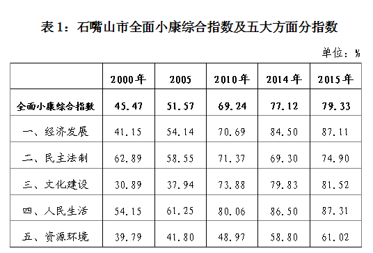 2015年,全市全面建成小康社会监测指标体系从五大方面39项指标(4项指标不纳入监测)进行了全面监测,其中:经济发展监测9项、民主法制监测3项、文化建设监测5项、人民生活监测12项、资源环境监测6项,共监测35项指标。