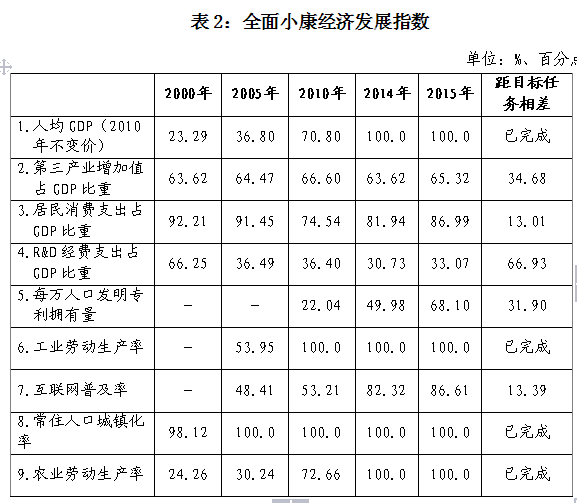 从监测的9项指标看:一是有4项指标实现达标。2015年,全市人均GDP实现60925元/人(目标值≥58000,按2010年不变价计算);工业劳动生产率达29.54万元/人(目标值≥12万元/人);农业劳动生产率达2.34万元/人(目标值≥2万元/人);常住人口城镇化率达73.68%(目标值≥60%)。上述4项指标已完成全面建成小康目标任务。二是有5项指标实现提升。2015年,全市第三产业增加值占GDP的比重为30.7%(目标值≥36%),完成目标任务的65.32%,比2014年提高1.7个百分点;居民消费支出占GDP比重为31.32%(目标值≥36%),完成目标任务的86.99%,比2014年提高5.05个百分点;R&D经费支出占GDP的比重为0.83%(目标值≥2.5%),完成目标任务的33.07%,比2014年提高2.34个百分点;每万人发明专利拥有量为2.38件(目标值≥3.5件),完成目标任务的68.10%,比2014年提高18.12个百分点;互联网普及率为43.31%(目标值≥50%),完成目标任务的86.61%,比2014年提高4.29个百分点。