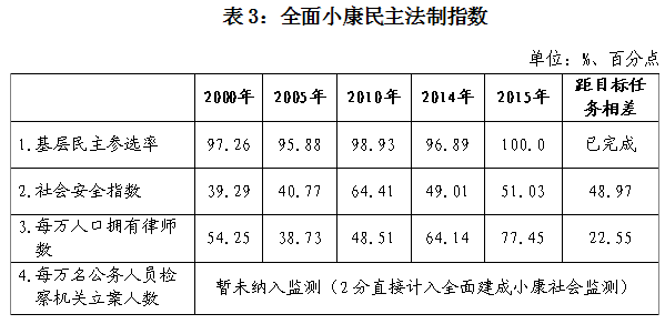 从监测的3项指标看:全市基层民主参选率为97.4%(目标值≥95%),已完成全面建成小康社会目标任务,比2014年提高3.11个百分点。社会安全指数为51.03%,比2014年提高2.01个百分点。分小项来看,2015年,全市刑事犯罪人数1046人,比2014年多51人;火灾事故死亡人数5人,比2014年多1人;交通事故死亡人数64人,比2014年少10人;工矿商贸死亡人数14人,比2014年少2人。2015年,全市拥有专职执业律师139人,每万人口拥有律师数1.76人(目标值≥2.3人),实现程度为77.45%,比2014年提高13.31个百分点。
