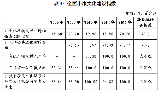 从监测的5项指标看:一是有3项指标实现达标。2015年,全市有线广播电视入户率达70.3%(目标值≥60%);全市拥有4个图书馆、4个文化馆、8个博物馆、35个文化站,使全市“三管一站”覆盖率达157.6%(目标值大于等于110%);城镇居民和农村居民文化娱乐服务支出占家庭消费比重分别为4.97%和2.23%,综合城乡居民文化娱乐服务支出占家庭消费比重达4.25%(目标值≥4.2%),此项指标为2015年首次完成目标任务,比2014年提高5.77个百分点。上述3项指标已完成全面建成小康社会目标任务。二是人均公共文化财政支出小幅提高。2015年,全市公共财政文化支出1.08亿元,人均支出138.4元(目标值150元/人),实现程度为92.27%,比2014年小幅提高0.88个百分点。三是文化产业有所发展。2015年,文化及相关产业实现增加值4.85亿元,占GDP比重为1.01%(目标值≥5%),实现程度为20.20%,比2014年提高1.4个百分点。